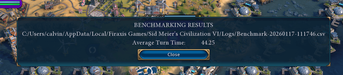 Turn time dropped from 44.25s to 34.42s (about 22% faster). If you play Civ, that's a real quality-of-life improvement that you feel constantly.