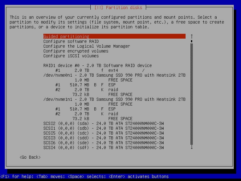 For the OS drives, I used the two Samsung 990 Pro 2 TB SSDs as a mirrored mdadm RAID1, so the machine can lose either NVMe drive and still boot and run normally.