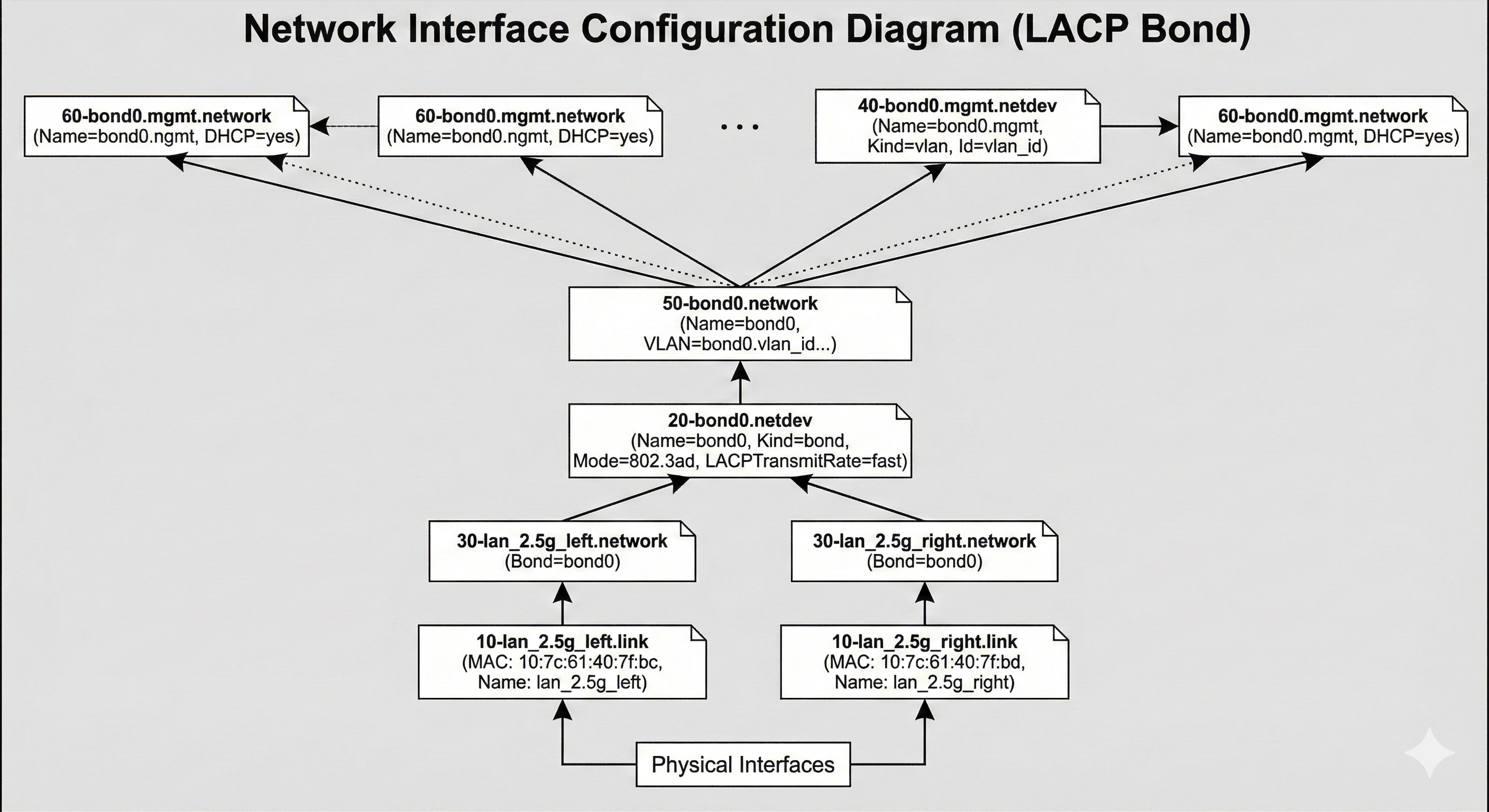 I built the bond with systemd-networkd rather than the old /etc/network/interfaces style configuration. The bond is bond0 in 802.3ad mode, with both NICs attached as slaves. I also renamed the interfaces based on their MAC addresses so they have stable, human-readable names instead of whatever the kernel decides on a given day.