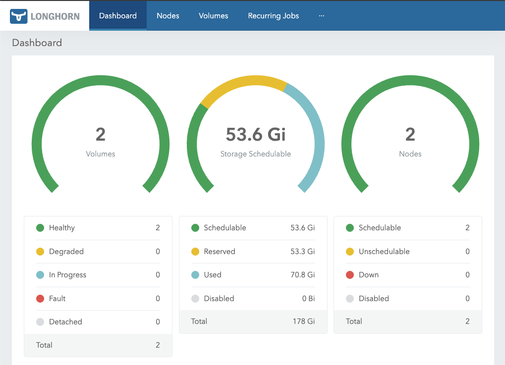 The total available space is around 60GB. As previously mentioned, the free tier is limited to 200GB. Disk space is also reserved for the operating system and container images automatically by Longhorn. As data is replicated, this cuts the total in half again.