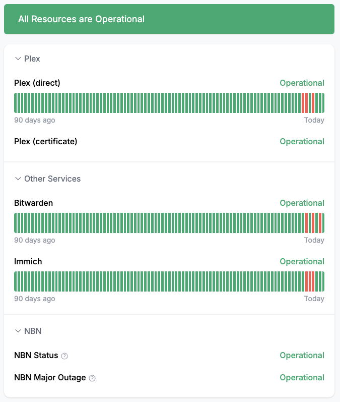 - Host a status page to keep users of my Plex, Immich and Bitwarden instances informed about uptime and maintenance.
