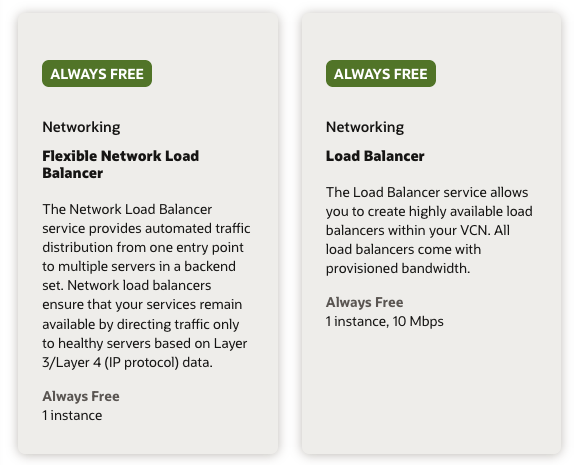 One Flexible Network Load Balancer (L3/L4) and one regular Load Balancer (L4/L7) are provided in the Always Free tier.