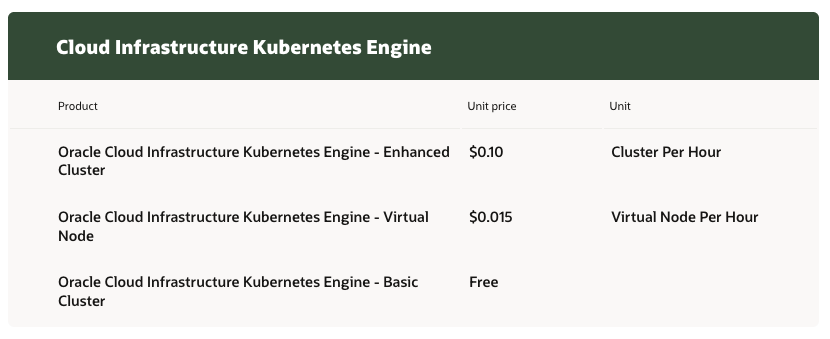 OKE provides basic and enhanced clusters. From the pricing page, a basic cluster is free of charge, while enhanced clusters are $0.10 per hour. The differences between them are covered in the OCI docs.