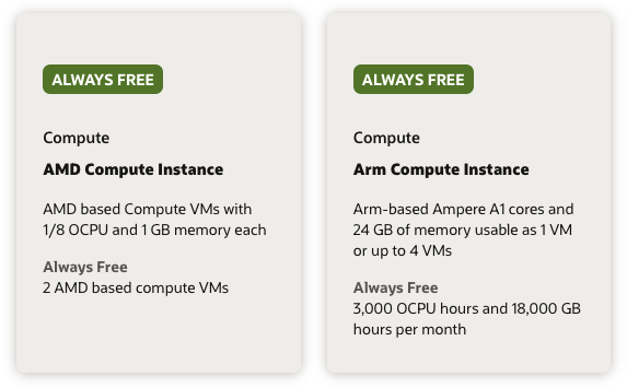 OCI accounts, whether free or paid, have a set of resources that are free of charge in the home region of the tenancy, for the life of the account. Using the Always Free resources, you can provision a virtual machine (VM) instance, the networking, load balancing, and storage resources needed to support the applications that you want to build. With these resources, you can run a small-scale Kubernetes cluster. The search for this solution led me to discover the generous free tier from Oracle Cloud for hosting.