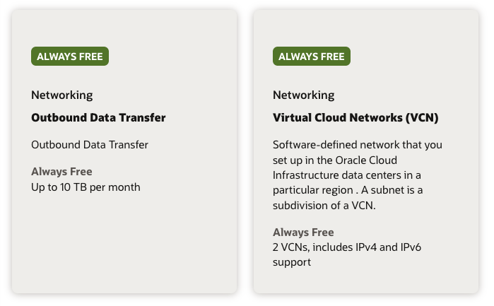 Two Virtual Cloud Networks (VCNs) can be created in the Always Free tier. This includes all its associated resources such as Subnets (unlimited), NAT Gateways (1), Service Gateways (1), Internet Gateways (1) and Security Lists (5).
