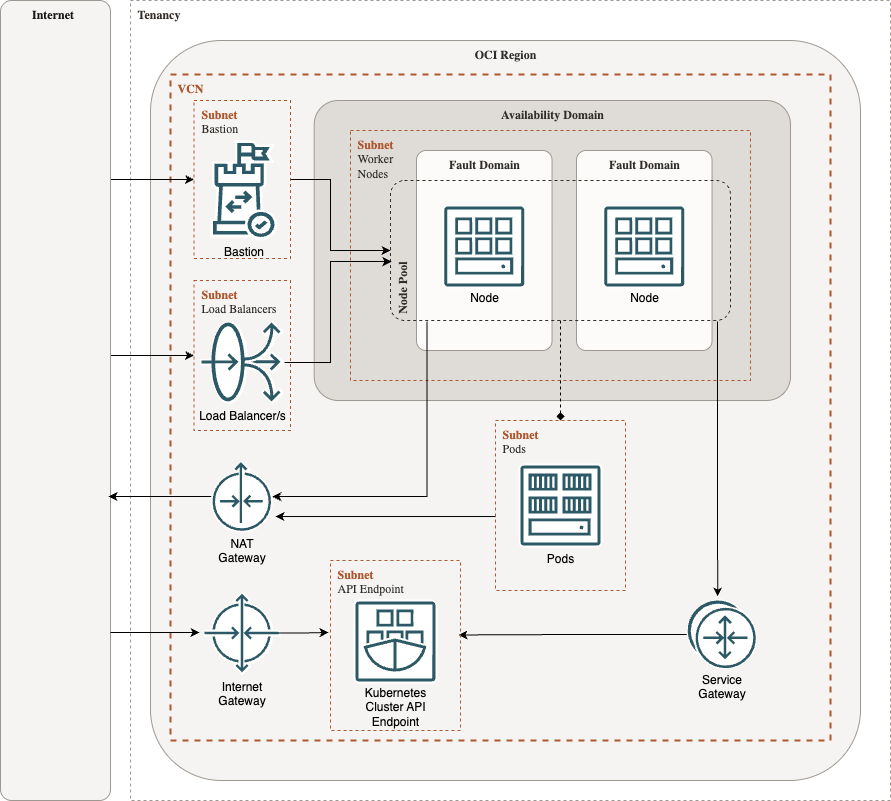 - Internet Gateway (oci_core_internet_gateway): allows access from the internet to resources in the public subnet (i.e. control plane and load balancers).