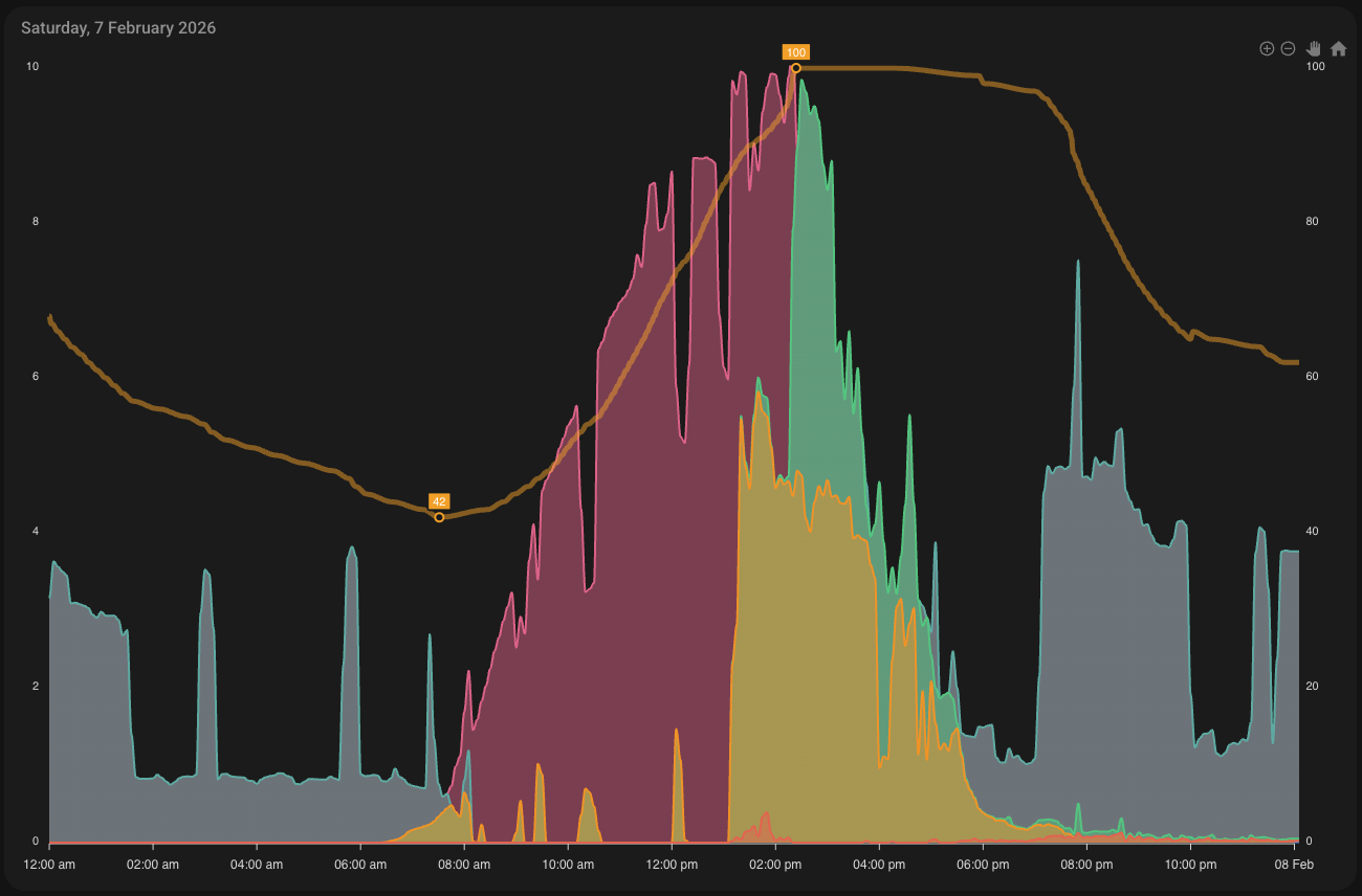 I updated my dashboard graph to include battery charge, discharge, and state of charge. Seeing the charge go down to 66% overnight, then back to 100% the next day, is satisfying.