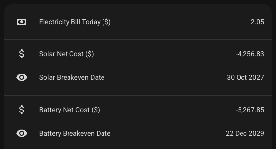 As of today, the breakeven date for the battery is 22 December 2029, or about 4 years. That is a huge improvement compared to the 10+ years it used to be before the scheme, and also better than the 8-year estimate I got for a Powerwall.
