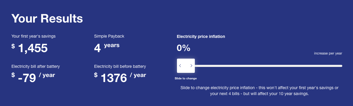 Compared to Powerwall pricing, it felt like the deal of the century. For roughly half the price of a Tesla Powerwall 3 installed, I was getting about four times its capacity. Doing the calculations again, the payback period was now 4 years. Changing the inflation slider made no changes to the result.