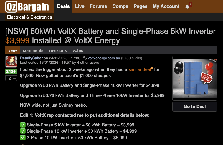Then this deal popped up on OzBargain. VoltX Energy were advertising a 50 kWh battery and 5 kW inverter package for $3,999 installed for Black Friday.