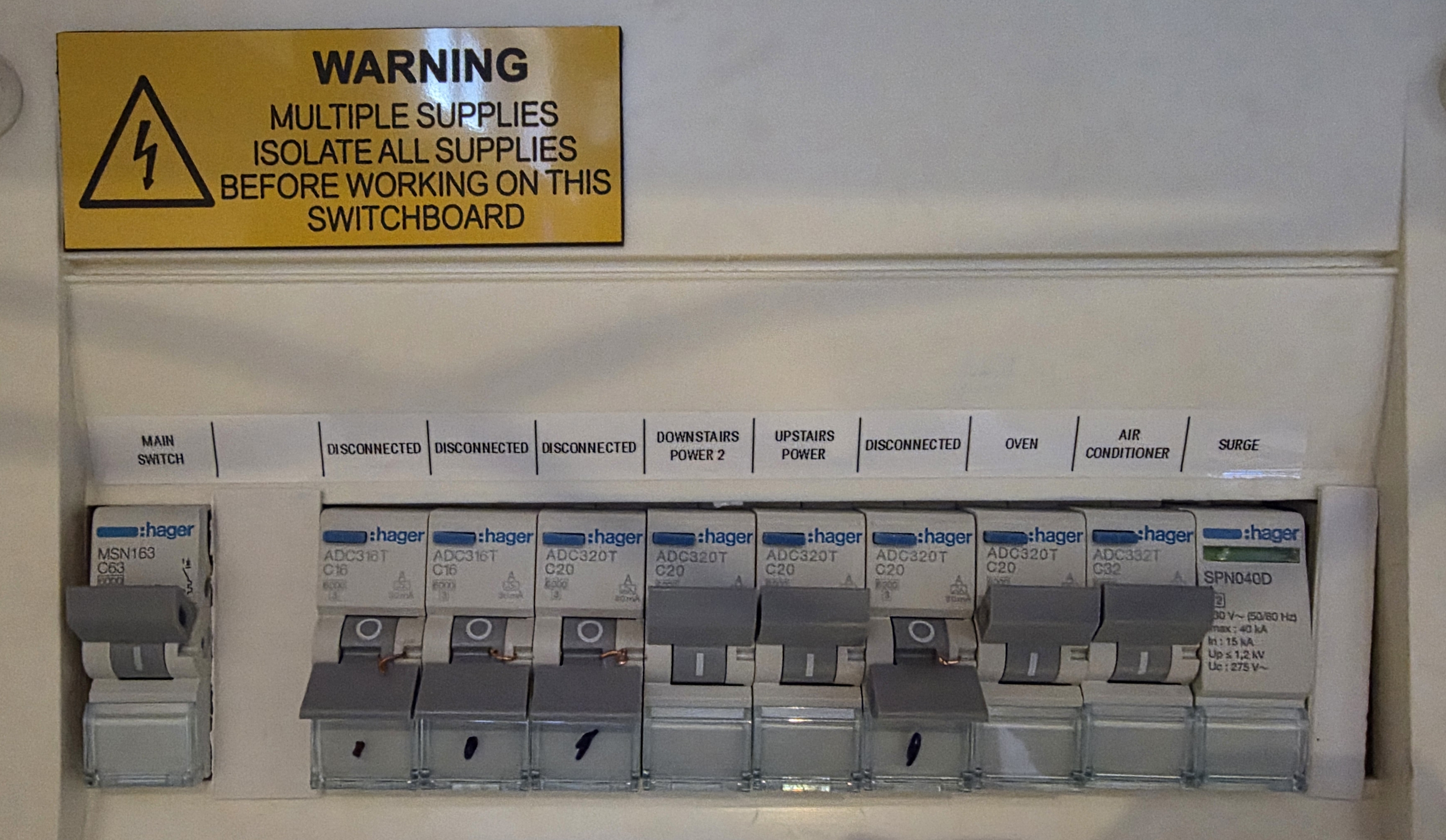 That new board includes the blackout protection gear (a Chint 63A auto changeover switch) and the 4 circuits I chose to be backed up: