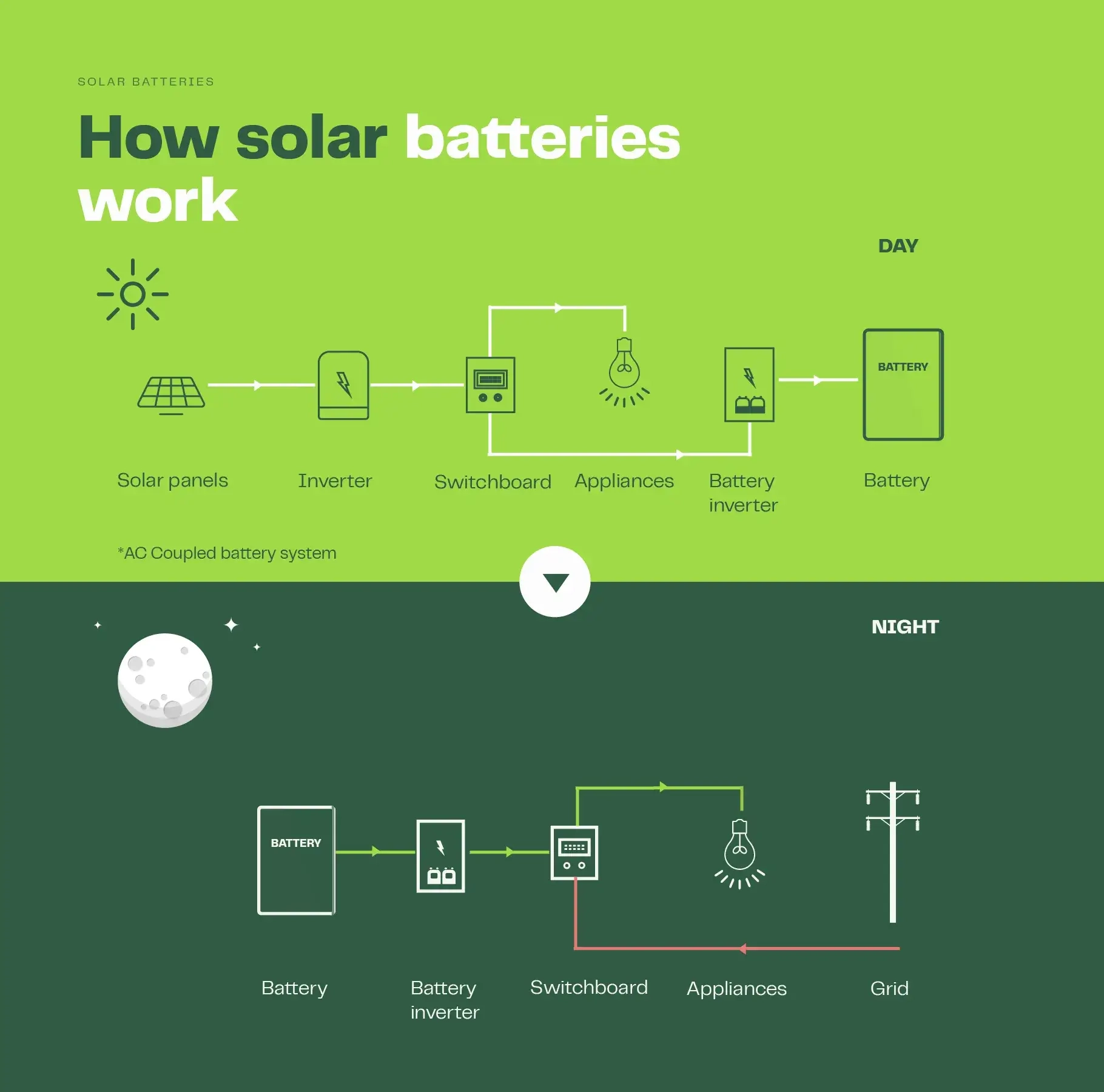 This system is AC-coupled. In simple terms, that means the battery system sits on the AC side of the house and works with your existing solar inverter. The alternative is DC-coupled, where the battery shares the DC side with the solar panels (usually via a hybrid inverter). AC coupling is a common retrofit approach because it does not require replacing an existing solar inverter.
