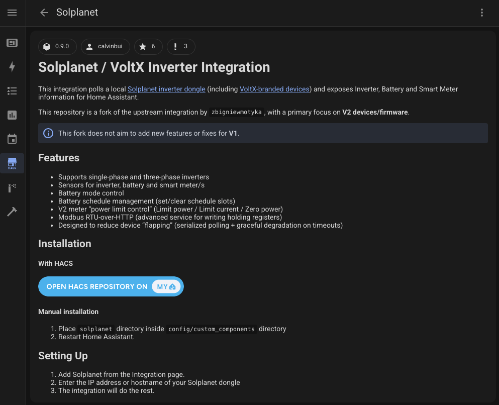I maintain the Solplanet integration for Home Assistant. I originally forked it from an earlier version by zbigniewmotyka, because it did not support the newer VoltX-branded inverters.
